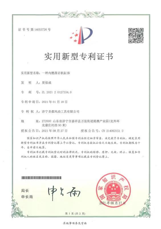 近日,由濟(jì)寧圣都風(fēng)動(dòng)有限公司自主研發(fā)生產(chǎn)的“一種內(nèi)燃鑿巖機(jī)缸體”的發(fā)明專利產(chǎn)品成功獲得國(guó)家知識(shí)產(chǎn)權(quán)局授權(quán),這是我公司在內(nèi)燃鑿巖機(jī)配件領(lǐng)域的又一突破,標(biāo)志著公司的科技創(chuàng)新研發(fā)能力又一次技術(shù)領(lǐng)域的新突破,為推動(dòng)企業(yè)高質(zhì)量發(fā)展提供了有力支撐。